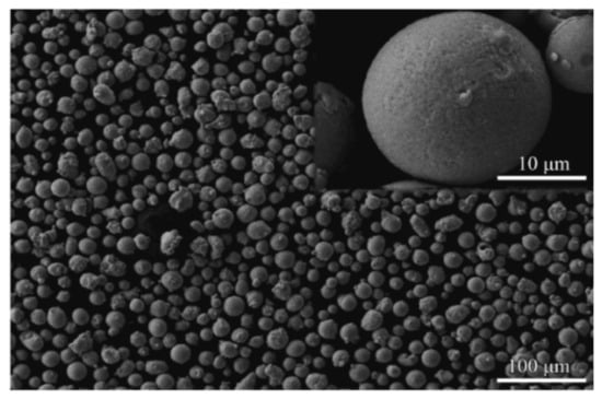 The powder used in this study was a NiCrAlY alloy powder produced by H.C. Starck (AMPERT 413, Munich, Germany). The powder is a type of spherical powder with a size range of 15 to 45 µm, and the average powder particle size is 22 µm. The morphology of the powder is shown in Figure 1. The nominal chemical composition of the powder is listed in Table 1.