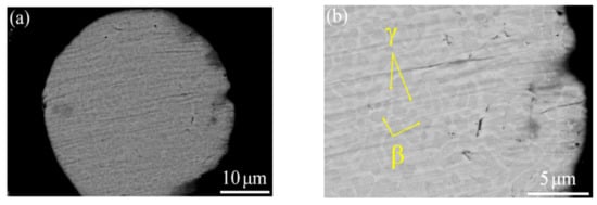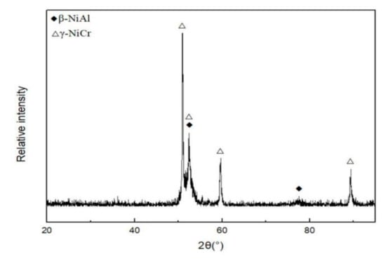 The phase composition was identified from the XRD result, as shown in Figure 2. Figure 3 depicts a two-phase microstructure in thermal spray powder. The β-NiAl phase (gray) is distributed on the γ-NiCr phase (white) matrix.