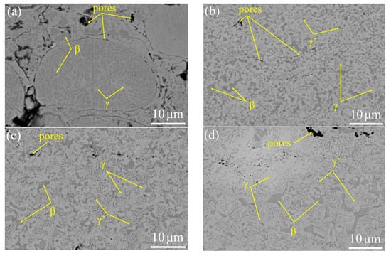 The microstructure of the as-sprayed and VHT coatings is shown in Figure 4. Figure 4a illustrates high porosity. The as-sprayed coating accumulated unmelted powders, and the microstructure of unmelted powders was the same as that of the powder. Figure 4b–d, respectively, present the microstructure of VHT1000, VHT1100 and VHT1200 coatings. The porosity of the VHT coating is shown in Table 3, compared with the microstructure of the as-sprayed coating, the porosity considerably decreased. The β-NiAl became highly discrete, and its morphology changed as the VHT temperature increased (Figure 4b–d). The β-NiAl in the as-sprayed coating exhibited a globular or ellipsoid morphology, the same as that in the powder (Figure 4a). After VHT, some irregular block β-NiAl phases appeared in the coating (Figure 4c,d). The new phase of γ’-Ni3Al (gray) was generated in VHT coatings. In VHT1000, γ’-Ni3Al presented a granular morphology. In VHT1100 and VHT1200, the morphology of γ’-Ni3Al changed to a lamellar morphology.