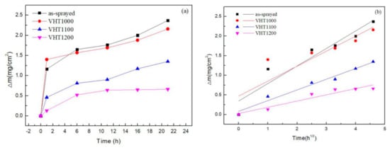 The results of the mass gain of oxidized samples were unified per unit area. The curve of average mass change versus time is plotted in Figure 5a. In the early stage of oxidation, the mass gains of the as-sprayed coating and VHT1000 were extremely high. However, the oxidation rate was relatively slow in the subsequent oxidation process. The mass gain of VHT1000 was slightly lower than that of the as-sprayed coating. A semiparabolic mass gain was observed for VHT1100 and VHT1200 with increasing time. The parabolic trend of mass gain in VHT1200 was reduced compared with that in VHT1100, which indicated a lower rate of mass gain and higher oxidation resistance.