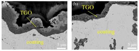 Figure 7 shows TGO on the surface of oxide samples. TGO layers were generated on the surface of the as-sprayed coating and VHT coatings. The TGO thickness of the as-sprayed coating is about 8 μm. The TGO thickness of all three VHT coatings is about 5 μm.