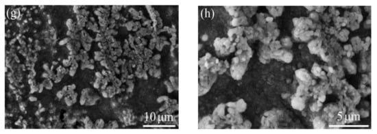 Morphology of oxide on the surface of the coatings. (a,b) As-sprayed, (c,d) VHT1000, (e,f) VHT1100, and (g,h) VHT1200.