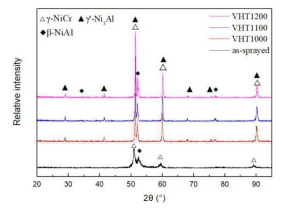 Figure 9 presents the XRD results of the as-sprayed and VHT coatings. The phase composition of the as-sprayed coating consisted of γ-NiCr and β-NiAl phases. After heat treatment at different temperatures in a vacuum furnace, the VHT coatings had new diffraction peaks of γ’-Ni3Al.