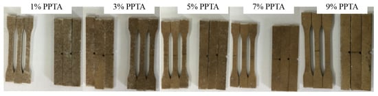 The blending method adopts the mixing method combining dry and wet methods. The detailed steps are as follows. First of all, the pretreated powder and reinforcer were weighed according to the mass percentage, and a certain amount of ethanol solution was poured into a high-speed mixer for mixing. Then, the sieved PTFE powder was slowly poured into the stirring ethanol solution, and then placed in a drying oven at 80 °C for drying and cold-pressed into preformed samples. The preformed sample was put into a box-type electric furnace for sintering to form a composite material sample. Finally, the sample was cut into test specimens with a punching knife for testing. Test samples of composite materials are shown in Figure 5.