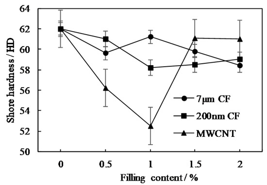The impact of different types and contents of carbon materials on the hardness of filled with modified PTFE is shown in Figure 6. During the experiment, we tested each set of the data five times, and calculated the average and standard deviation. It can be seen from Figure 5 that the hardness of PTFE decreased slightly after adding different carbon materials. Among them, the hardness of PTFE composites filled with MWCNT decreased most significantly. When the filling amount of MWCNT was 1%, the hardness of the composite material decreased from 62 to 52, which was 15.3%. With the increase of the content of MWCNT, the hardness rebounds. When the filling amount of 200 nm CF was 1%, the hardness of the composite material dropped from 62 to 58.2, with a decrease of 4.8%. When the filling amount of 7 μm CF was 0.5%, the hardness of the composite material dropped from 62 to 59.6, with a decrease of 5.9%.