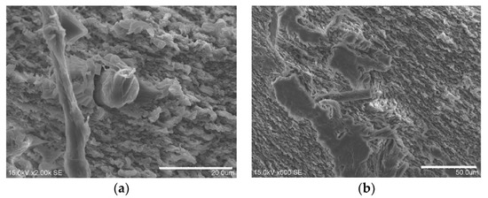 Figure 20. SEM image of cross section of PPTA modified composite material: (a) stretched section view and (b) impact section.