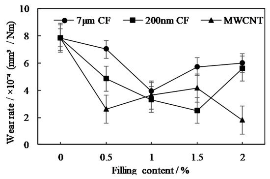 Through the friction and wear test of 200 nm and 7 μm CF and MWCNT filled PTFE composite materials, it was found that when 7 μm CF was used as the modified filler and the mass fraction was 1.5%, the composite wear rate decreased from 7.8463 × 10−4 to 2.5124 × 10−4 mm3/Nm, with a decrease rate of 58%. Then the wear rate of the composite material increased slightly. When 200 nm CF was used as the modified filler and the mass fraction was 1%, the wear rate of the composite material decreased from 7.8463 × 10−4 to 3.9038 × 10−4 mm3/Nm, with a decrease rate of 50.3%. Then the wear rate gradually increased. When MWCNT was used as a modified filling and the mass fraction was only 0.5%, the wear rate of the composite material decreased from 7.8463 × 10−4 to 2.5897 × 10−4 mm3/Nm, with a decrease rate of 57%.