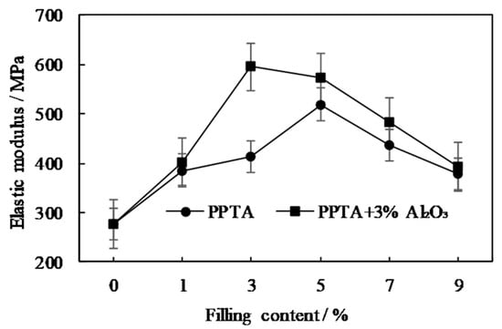 It can be seen from Figure 17 and Figure 18 that the tensile strength and elongation at break of PTFE were significantly reduced by adding PPTA. When the PPTA content was 1%, the tensile strength of the composite material dropped from the original 27.9 to 18.6 MPa, with a decrease rate of 33%. At this time, the tensile elongation at break decreased from the original 810–520%, which was only 64% of that of unmodified PTFE at break. When 3% nano Al2O3 particles and PPTA were compounded and modified into PTFE, the composite tensile strength further dropped to 13.2 MPa, which was only 50% of the tensile strength of unmodified PTFE, while the tensile elongation at break decreased to 215%, which was only 26% of unmodified PTFE tensile elongation at break. With the increase of the PPTA content, the tensile strength of the composite material did not change significantly, while the tensile elongation at break further decreased. When the PPTA content was 9%, the tensile elongation at break of the composite material was only 16%. It can be seen from Figure 19 that PPTA and nano Al2O3 particles rapidly increased the elastic modulus of PTFE. When PPTA was added at 5%, the elastic modulus reached the highest point of 519 MPa, which was 1.8 times that of unmodified PTFE. With the further increase of PPTA content, the elastic modulus of the composite material gradually decreased. When 3% nano Al2O3 particles were compounded and modified with PPTA, the elastic modulus of the composite material was further improved on the basis of only PPTA. Among them, when the addition amount of nano Al2O3 particles and PPTA was 3%, the elastic modulus reached the highest point 595 MPa.