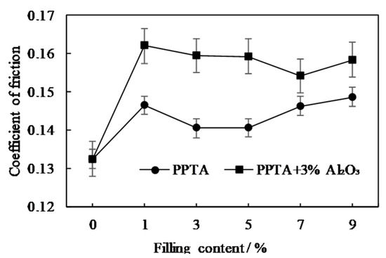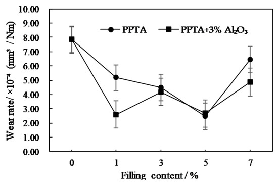 When the content of PPTA exceeded a certain amount, the wear rate of the composite material presented an instantaneous surge. This is mainly because the composite material mainly adhered to each other through the PTFE matrix and transferred the load to the fibers. Due to the large specific surface area of PPTA, when PPTA increases to a certain content, the PTFE matrix will not be able to bond with PPTA well. However, the interaction between PPTA is mainly through an electrostatic force, so the fibers are easy to be peeled off and pulled out, which makes the overall performance of the composite material drop sharply.