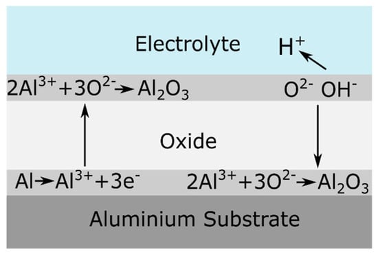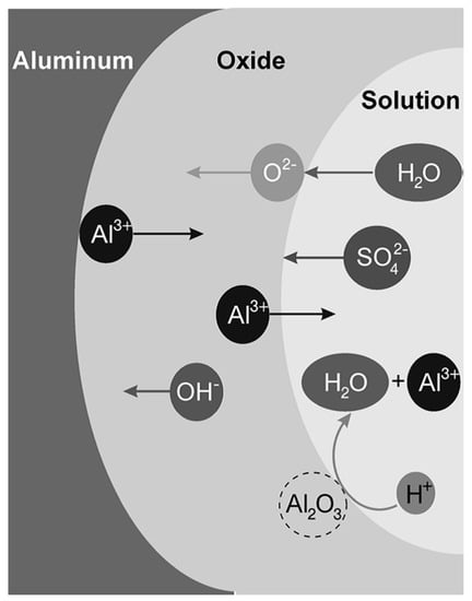 Anodizing is an electrochemical process to artificially thicken the oxide film on a metal surface, creating an oxide layer of up to several micrometers thick. This artificial oxide film forms on aluminum when a current at sufficient voltage flows through an electrolyte in which the aluminum is the anode and a suitable material is the cathode [39]. The involved mobile species in the anodizing of pure aluminum in aqueous solutions are Al3+ cations, and O2− or OH− anions [40,41]. The oxidation of aluminum at the aluminum/oxide interface generates the Al3+ cations, while O2− or OH− anions form at the oxide/solution interface by the stripping of H+ from H2O molecules [40].