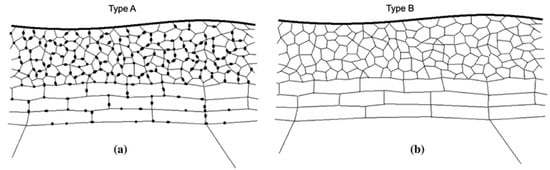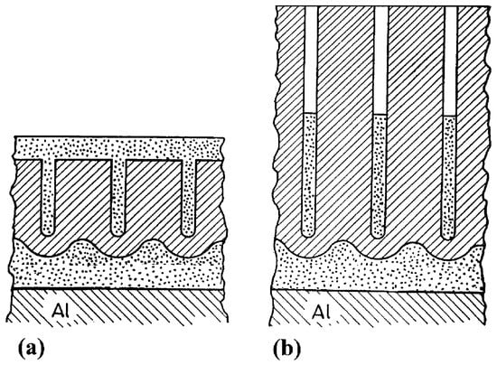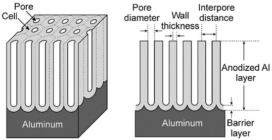 On the contrary, if the anodic oxide film is soluble in the electrolyte, a porous oxide film forms. These porous oxide layers are the ones relevant for aerospace applications. The pores are oriented perpendicular to the metal surface at the center of a cell and the cells ordered in a hexagonal array [41,42,43]. A thin barrier layer of scalloped morphology is present at the pore base. The morphology of an ideal porous anodic layer is schematically illustrated in Figure 4.