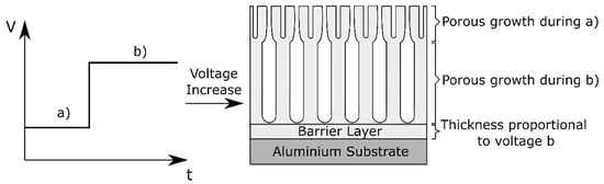 Conversely, when the potential is increased, a current overshoot is observed and a new steady rate of film growth is reached relatively quickly [68]. The anodizing efficiency increases during a potential rise, because for a certain period of time the current exceeds the equilibrium current at the steady-state [69]. In this case, also a graded morphology is reported [68]. This is schematically visualized in Figure 5.