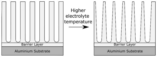 During the process of aluminum anodizing, not only the mass transfer needs to be considered, but also the heat transfer [40]. Heat is produced during anodizing mainly by Joule heating due to ionic current passing through the highly resistive oxide layer on the aluminum electrode [40]. Aerts [40] dealt in his PhD thesis with the role of heat transfer and the role of the electrolyte and electrode (i.e., the aluminum part) temperature during anodizing. The electrolyte temperature has an effect on the oxide morphology, visualized in Figure 7. High electrolyte temperatures lead to pore widening close to the oxide/electrolyte interface [79]. This effect is caused by the higher aggressiveness of the electrolyte at higher temperatures, which accelerates the oxide dissolution reaction. The pore widening effect is gradually reduced towards the alloy/oxide interface [79]. In fact, the pore diameter is found to be proportional to the applied formation voltage and independent of the electrolyte temperature in regions close to the barrier layer [79].