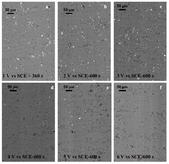 Scanning electron micrographs of the surface of a AA2024 T3 alloy after anodizing under potentiostatic conditions in sulfuric acid electrolyte at room temperature and different voltages. Reprinted with permission from [48]; Copyright 2008 The Electrochemical Society, IOP Publishing.