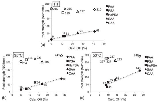 Average dry (empty markers) and wet (filled markers) peel strength vs. the calculated hydroxyl percentage at the surface on barrier-type oxides after anodizing at (a) RT, (b) 35 °C, and (c) 50 °C. Reprinted with permission from [94]. Copyright 2016 American Chemical Society.