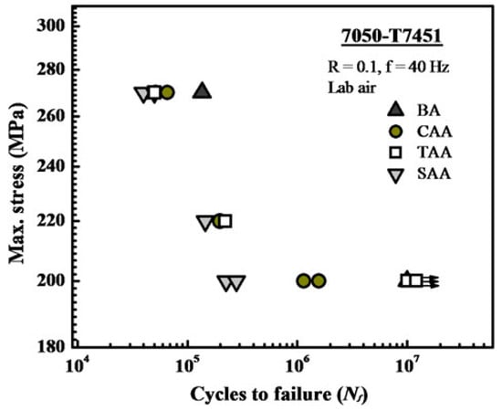 7050-Z7451 S-N fatigue test results before anodizing (BA) and after anodizing in chromic acid anodizing (CAA), tartaric-sulfuric acid anodizing (TAA), and sulfuric acid anodizing (SAA). Reprinted with permission from [112]; Copyright 2012 Springer Nature.