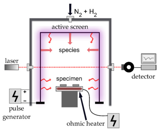 - Burlacov, I.; Hamann, S.; Spies, H.-J.; Röpcke, J.; Biermann, H. In-line Process Control in the Active Screen Plasma Nitrocarburizing Using a Combined Approach Based on Infrafred Laser Absorption Spectroscopy and Bias Power Management. HTM J. Heat Treat. Mater. 2016, 71, 141–147. [Google Scholar] [CrossRef]