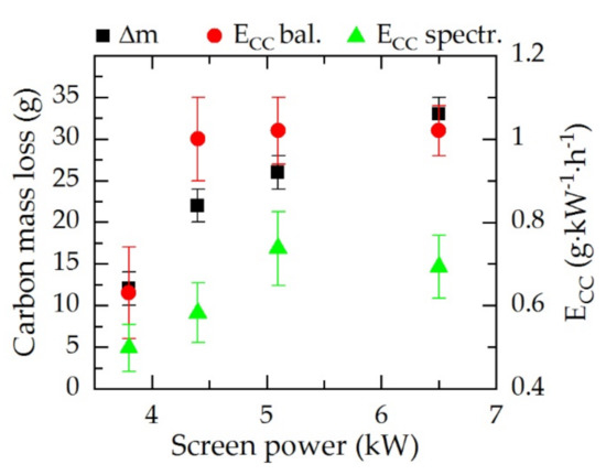 Carbon mass loss (Δm, black) and carbon consumption (ECC) determined after the process by the balance (ECC bal., red) and by spectroscopic data (ECC spectr., green) of the screen material in dependence of the resulting screen power for a gas composition of N2:H2 = 1:1, 5 h treatment time.