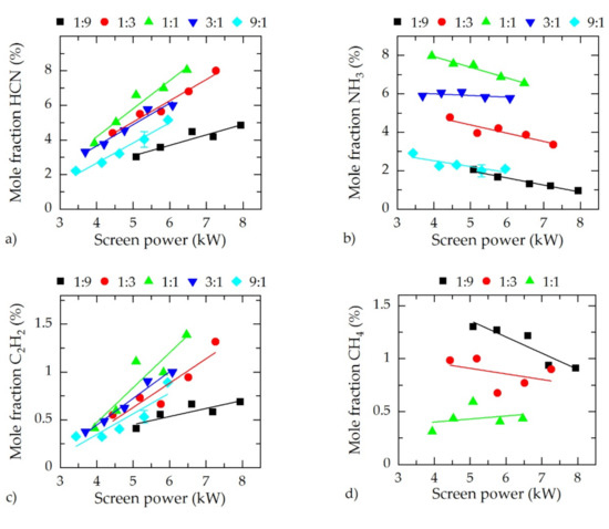 In Figure 3, the spectroscopic results using IRLAS are presented. For the species HCN, NH3, C2H2, and CH4, the mole fractions in dependence of the screen power for the gas compositions N2:H2 = 1:9, 1:3, 1:1, 3:1, and 9:1 are shown.