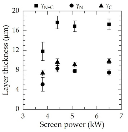 Independent of the screen power, a covering duplex expanded the austenite surface layer developed consisting of a nitrogen expanded austenite (γN) at the surface and an inner carbon expanded austenite (γC) indicated in Figure 4. From the micrographic pictures, the layer thicknesses were subsequently derived and are presented in Figure 5.