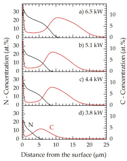 The specimens revealed a power dependence for the carbon and nitrogen distributions within the expanded austenite. At 3.8 kW, the maximum content of nitrogen was up to 22 at.%, and the maximum carbon content was up to approximately 5 at.%. A major increase both in nitrogen and carbon concentrations were observed at 4.4 kW screen power, at which the incorporation of nitrogen reached up to 27 at.% and for carbon up to 8 at.%. Thus, both the nitriding and the carburizing potential increased. A further increase in screen power up to 5.1 kW did not significantly affect the carbon and nitrogen distributions (Figure 6); however, at 6.5 kW the maximum content of nitrogen increased to 34 at.%, while the maximum content of carbon increased to 9 at.%. Additionally, the diffusion depth of nitrogen (11 μm) and carbon (approximately 24 μm) enlarged.
