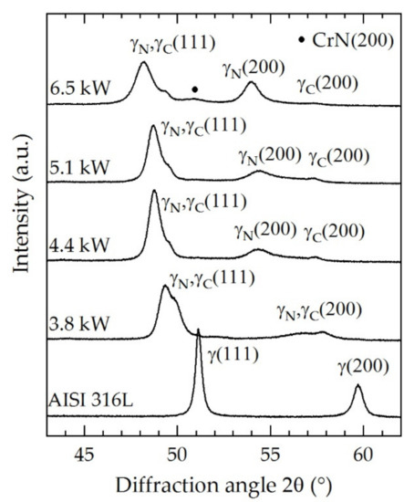 The diffraction profile of the base material (AISI 316L) showed defined and sharp peaks for γ(111) at approximately 51° and γ(200) at approximately 60°. After treatment, the austenite peak positions shifted to lower angles as a result of the lattice expansion. Due to the thickness of the expanded austenite layers, the base material was not detectable. Typically, the expansion is larger for γ(200) than for γ(111) because of the crystallographic anisotropy [37]. After the ASPNC treatment at 3.8 kW, a peak splitting was detected due to the formation of the dual layer made of γN (49.3°) and γC (50.0°) with different lattice parameters. Thereby, the level of expansion turned out to be larger for γN. The layer thicknesses of γN are considerably lower compared to the penetration depth of the radiation. Thus, a distinct and shifted dual peak was detected since γC was also detected. Additionally, for all peaks shown in Figure 7, broadening occurred which can be attributed to micro-strains and the element–depth concentration profiles. An increase in the screen power to 4.4 kW increased the concentration of nitrogen and carbon inside the expanded austenite (Figure 6). As a result, atomic spacing increased and a further lattice expansion for both γN (48.8°) and γC (49.5°) occurred, resulting in a peak shift to lower angles. Furthermore, the intensity of γN increased, which can be attributed to the thicker γN layer and lower detected volume of γC. Therefore, the intensity of γC decreased correspondingly. Another increase in the screen power to 5.1 kW did not change the diffraction profile significantly. The γN(200) and γC(200) peaks showed similar behavior compared to the condition of the 4.4 kW screen power. However, the peak splitting for the (200) peak profile was significantly larger than in the case of the (111) peak profiles. At 6.5 kW, the absolute concentration of nitrogen inside the expanded austenite increased. Thus, the (111) and (200) peaks of γN were further shifted and broadened while γC(200) was not strongly affected. Additionally, CrN can be detected at 6.5 kW which is not visible in the cross-section (Figure 4).
