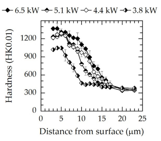 After ASPNC, a typical smooth hardness gradient resulted. In the case of the lowest level of screen power (Pscreen = 3.8 kW), the hardness profile significantly deviated from the other profiles, as the measured hardness was lower for the full range of diffusion depth. A maximum hardness of 1150 HK0.01 was observed. Due to the higher nitrogen content inside γN, maximum hardness values of approximately 1200–1300 HK0.01 were obtained for screen power levels at and above 4.4 kW. At high screen power levels, in the range of γN, a hardness plateau was measured up to a depth of 6 µm which subsequently declines toward the base material analogously to the carbon concentration decrease (Figure 6). A reduction in hardness occurred in the transition zone between γN and γC and can be related to decreasing nitrogen contents. Although treatment at 4.4 and 5.1 kW yielded nearly identical γN hardness values as well as nitrogen and carbon distributions, higher hardness values inside γC were obtained for the 4.4 kW screen power. A further increase to 6.5 kW led to a higher maximum hardness of 1400 HK0.01, which can be attributed to higher nitrogen concentrations and the formation of CrN. Additionally, a hardness plateau like for the other powers was not visible which might be attributed to the formation of CrN at the first few micrometers. The subsequent hardness decline toward the base material was not strongly affected; however, the hardness values were slightly higher.