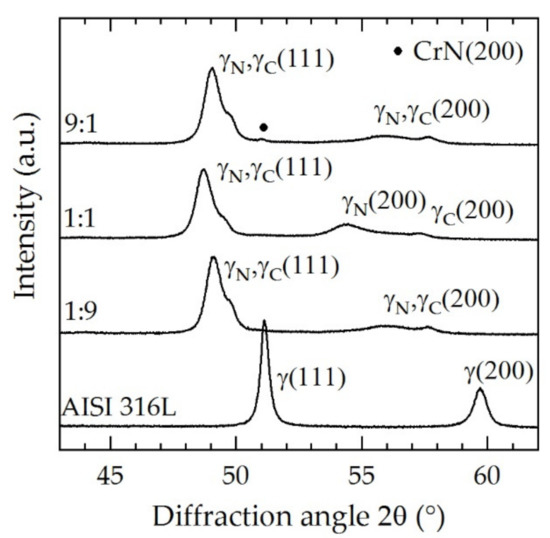 Like in all specimens, the peaks shifted to lower angles and peak splitting occurred. For N2:H2 = 1:1, the peaks shifted to the lowest angle due to the higher amount of nitrogen solved in the expanded austenite layer. For both N2:H2 = 1:9 and 9:1, the peak shift was lower compared to N2:H2 = 1:1. The differences between the gas compositions N2:H2 = 1:9 and 9:1 are relatively small. CrN formation was evidenced for N2:H2 = 9:1; however, we cannot estimate why it only occurred for this particular case. How gas composition and screen power affect CrN formation will be the subject of a future work.