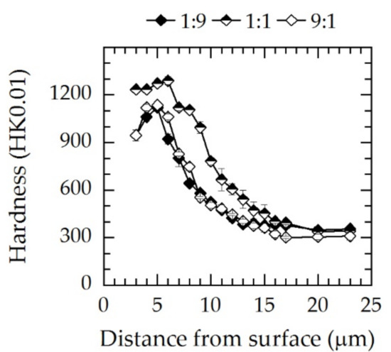 Microhardness–depth profiles measured on the cross-sections are presented in Figure 11. Analogously to the X-ray diffraction and GDOES profiles, it can be seen that the maximum hardness of approximately 1200–1300 HK0.01 was achieved for the gas composition N2:H2 = 1:1. For N2:H2 = 1:9 and 9:1, the maximum hardness was measured a few micrometers below the surface in γN and was significantly lower at 1100 HK0.01. Additionally, the hardness–depth profiles were equal within the measuring uncertainty and were consistent with the X-ray diffraction and GDOES analyses.