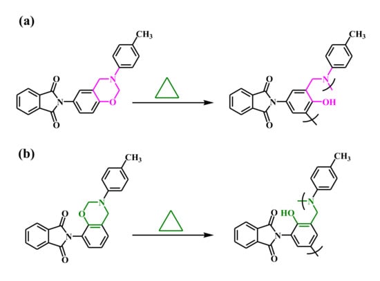 The monomers pPP-BZ and oPP-BZ were polymerized through thermally induced ROP to form phenolic structures featuring a Mannich base bridge (CH2NRCH). The cross-linking of each sample was performed using the following curing program: 150 °C (2 h), 180 °C (2 h), 210 °C (2 h); slow cooling to ambient temperature.