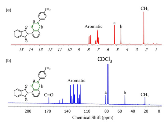 The para- and ortho-phthalimide-functionalized benzoxazine monomers were synthesized through reactions of the phthalimide-functionalized phenols pPP and oPP, respectively, p-toluidine, and paraformaldehyde in 1,4-dioxane, as presented in Figure 1c,d. The ring-closing reaction of oPP-BZ monomer was much easier than pPP-BZ, because of the existence of intermolecular hydrogen bond in oPP, which accelerates the ionization OH group during stages forming of oPP-BZ monomer, this behavior was reported elsewhere [5]. The ROP of the monomers pPP-BZ and oPP-BZ as shown in Figure 2. The structures of pPP-BZ and oPP-BZ were confirmed using 1H NMR spectroscopy (Figure 3a and Figure 4a). The signals of the aromatic protons were located at 6.75–7.9 ppm. The signals of the ArCH2N and OCH2N units of the oxazine rings were located at 4.5 and 5.2 ppm, respectively [34,35,36]. The signal of the methyl group appeared at 2.01 ppm. Figure 3b and Figure 4b present the 13C NMR spectra of the monomers pPP-BZ and oPP-BZ. The signals of the carbon nuclei of the ArCH2N and OCH2N units of the oxazine rings were located near 50 and 80 ppm, respectively. The signals for the symmetric C=O groups of the imide moieties were centered at 166.55 ppm. The signals of the aromatic rings appeared in the range of 119–150 ppm.