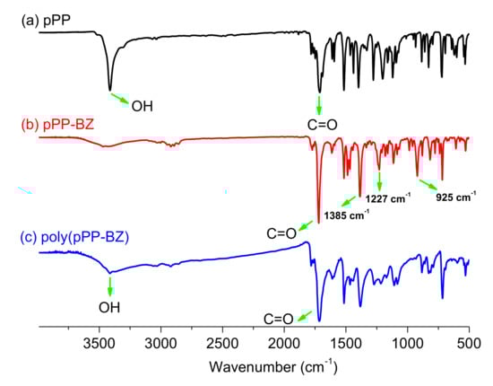 FTIR spectra of (a) pPP, (b) pPP-BZ, and (c) poly(pPP-BZ).