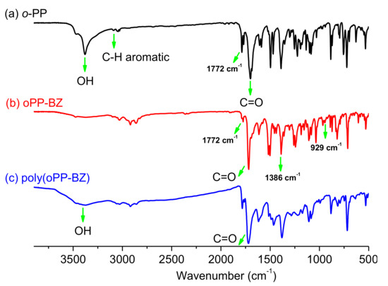 FTIR spectra of (a) oPP, (b) oPP-BZ, and (c) poly(oPP-BZ).