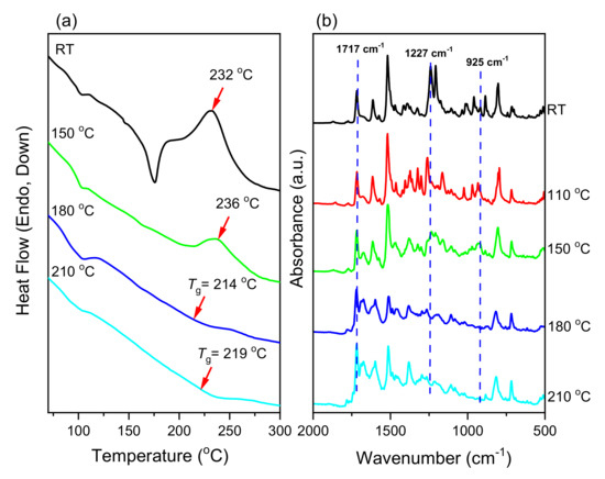 We used DSC and FTIR spectroscopy to study the ROP of the monomers pPP-BZ and oPP-BZ (Figure 2). Figure 7a and Figure 8b display DSC thermograms of pPP-BZ and oPP-BZ, respectively: uncured and after curing at 150, 180, and 210 °C. For the uncured pPP-BZ, the endothermic peak (melting point), exothermic peak (ROP), and heat of polymerization were 175 °C, 234 °C, and 49.42 J·g−1, respectively. The sharp and high melting peak indicated good purity for the phthalimide-modified benzoxazine monomer and its high rigidity (cf. other traditional benzoxazine monomers) as a result of the attachment of the imide group to the aromatic structure. For the uncured oPP-BZ, the endothermic peak was not evident because it partially overlapped the exothermic peak, which had shifted to 205 °C [5]. In this study, the exothermic peaks appeared at temperatures lower than those of some other reported imide-functionalized benzoxazines that have been used in the synthesis of high-performance materials [39]. The exothermic peaks of pPP-BZ and oPP-BZ disappeared completely after curing at 180 °C, indicating their complete ROP. Furthermore, the glass transition temperatures (Tg) of poly(pPP-BZ) and poly(oPP-BZ) after curing at 180 and 210 °C were obtained as mean values of the three repeated measurements and the standard deviation (SD) was calculated in Table 1. As shown in Table 1, the Tg values of poly(pPP-BZ) and poly(oPP-BZ) after curing at 180 and 210 °C were 214, 219 °C, and 212 and 217 °C, respectively. Thus, our new PBZs had values of Tg higher than those previously reported for the cross-linked material NDOPoda Bz (192 and 205 °C after curing at 180 and 210 °C, respectively) [40]. We attribute the high values of Tg of our polymers to their high densities of intra- and intermolecular hydrogen bonds between the phenolic OH groups and the N atoms in the Mannich bridges or the C=O groups in the imide structures.