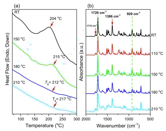 We also used FTIR spectroscopy to study the thermal ROP behavior of the monomers pPP-BZ and oPP-BZ (Figure 7b and Figure 8b, respectively). For pPP-BZ and oPP-BZ, bands appeared at 1227 and 1209 cm−1, respectively, for C–O–C antisymmetric stretching and at 925 and 929 cm−1, respectively, for out-of-plane bending of the benzene rings attached to oxazine rings. After curing at temperatures from 180 to 210 °C, the signals representing the oxazine rings of the monomers disappeared progressively and broad bands representing phenolic OH groups appeared in the range 3500–3300 cm−1, consistent with the formation of poly(pPP-BZ) and poly(oPP-BZ) (Figure 7b and Figure 8b).