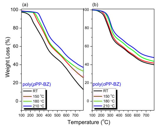 We used TGA to investigate the thermal stability of the uncured pPP-BZ and oPP-BZ and their corresponding polymers obtained after curing at 150, 180, and 210 °C (Figure 9a,b, Table 1). We considered the temperatures of 5 and 10% weight loss (Td5 and Td10, respectively) to characterize the thermal stabilities of the monomers and corresponding PBZs. The values of Td5 and Td10 and the char yields increased progressively upon increasing the curing temperature, due to the formation of highly cross-linked thermosets. For poly(pPP-BZ) after curing at 210 °C, the values of Td5 and Td10 and the char yield at 800 °C were 296 and 321 °C and 37 wt.%, respectively; for poly(oPP-BZ) after curing at 210 °C, these values were 264 and 281 °C, and 48 wt.% respectively. Thus, the thermal stabilities of our new polymers poly(pPP-BZ) and poly(oPP-BZ) cured at 210 °C were higher than that of Pp-IB, a monofunctional benzoxazine featuring an imide group (286 and 322 °C and 32 wt.%, respectively) [41]. The thermal stability and char yields of poly(oPP-BZ) (formed from the ortho-monomer) were much higher than those of poly(pPP-BZ) (formed from the para-monomer), because of a higher degree of cross-linking and a higher density of intramolecular hydrogen bonds.