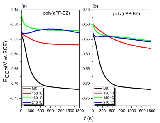 Eocp–time plots of (a) uncoated MS and MS coated with poly(pPP-BZ)150, poly(pPP-BZ)180, and poly(pPP-BZ)210 and (b) uncoated MS and MS coated with poly(oPP-BZ)150, poly(oPP-BZ)180, and poly(oPP-BZ)210, in 3.5 wt.% NaCl.