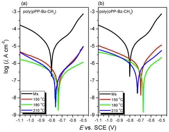 Tafel plots of (a) uncoated MS and MS coated with poly(pPP-BZ)150, poly(pPP-BZ)180, and poly(pPP-BZ)210 and (b) uncoated MS and MS coated with poly(oPP-BZ)150, poly(oPP-BZ)180, and poly(oPP-BZ)210 in 3.5 wt.% NaCl.
