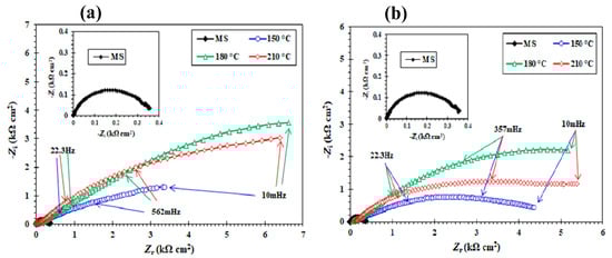 Nyquist plots of (a) uncoated MS and MS coated with poly(pPP-BZ)150, poly(pPP-BZ)180, and poly(pPP-BZ)210 and (b) uncoated MS and MS coated with poly(oPP-BZ)150, poly(oPP-BZ)180, and poly(oPP-BZ)210 in 3.5 wt.% NaCl.