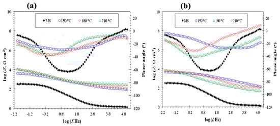 Bode and phase angle plots of (a) uncoated MS and MS coated with poly(pPP-BZ)150, poly(pPP-BZ)180, and poly(pPP-BZ)210 and (b) uncoated MS and MS coated with poly(oPP-BZ)150, poly(oPP-BZ)180, and poly(oPP-BZ)210 in 3.5 wt.% NaCl solution.