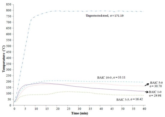 BAIC 3-5 had the lowest end temperature and standard deviation (σ) after exposing to a 60-min Bunsen burner test as compared to unprotected steel (σ = 171.19) and other BAIC coating sample protected steels. BAIC 3-5 exhibited the best fire-resistant outcome at only 112.5 °C and the lowest σ of 16.42 after one hour of fire resistance testing. However, samples BAIC 10-0, BAIC 5-0 and BAIC 1-0 revealed the σ values of 33.11, 30.70 and 29.98, respectively. The elevations of BAIC samples after one hour of fire resistance testing are shown in Figure 3.