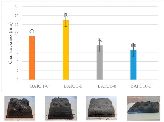 Carbolite furnace was used to examine all BAIC coating samples at a temperature of 600 °C. The char thickness of each sample is shown in Figure 4.