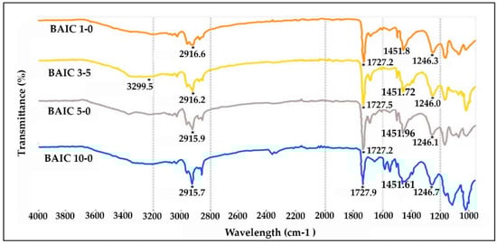 FTIR was used to characterize the cross linkage of molecular functional groups in all BAIC samples. The relationship of functional groups with adhesion strength then can be diagnosed []. Analysis of elemental functional groups with the peak wavenumber and band position of all BAIC samples is shown in Figure 10.