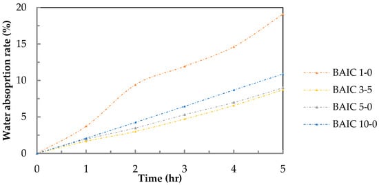 Water resistance of all BAIC samples were investigated using static immersion. The weight change of samples during the test was measured every one-hour interval up to 5 h. Water absorption rate of all samples, as shown in Figure 12.