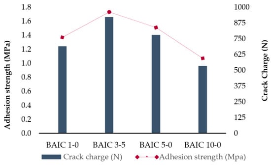 Adhesion strength was referred to the physical and chemical bonding of IC samples applied on the steel surface, and the strength required to entirely detach the coating samples from the steel surface. The crack charge value and adhesion strength of all samples are shown in Figure 13.