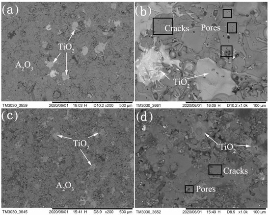 SEM morphologies of the AT13 coatings prepared at (a,b) nonoptimized parameters and (c,d) optimized parameters.