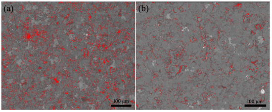 The porosities of the AT13 coatings prepared at nonoptimized and optimized parameters were evaluated by Image J software [25]. The results are shown in Figure 5, in which the red area represent the pores. It is observed that the porosity is much higher in the coating prepared at nonoptimized parameters than that at optimized parameters, which are 5.62 ± 1.71% and 3.05 ± 1.07%, respectively. The formation of porosity was also induced by the intrinsic characteristics of the plasma spray technique as discussed above. The faster cooling and solidification of the melt particles at nonoptimized parameters led to the increased possibility of large spaces among the melt particles, which brought into the high porosity.