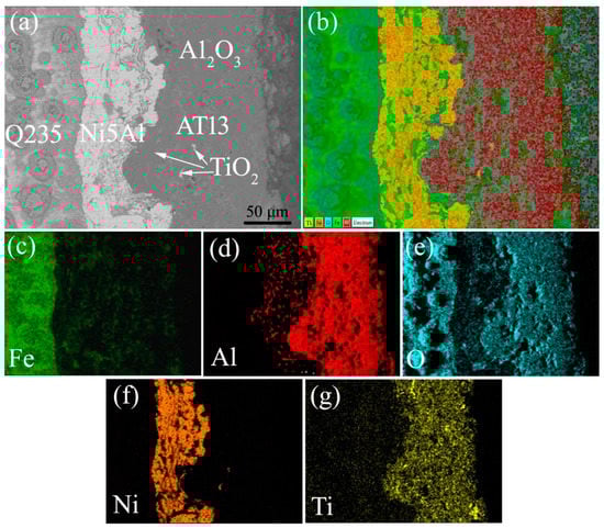 (a) Cross-sectional morphology of the coating prepared at optimized parameters and (b) the corresponding element mapping of (c) Fe, (d) Al, (e) O, (f) Ni, and (g) Ti.