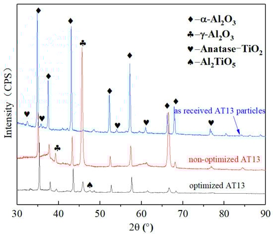 The XRD patterns of the as-received AT13 particles and AT13 coatings are exhibited in Figure 7. It is observed that the main phases of as-received AT13 particles are α-Al2O3 and anatase TiO2 phases. After spraying at nonoptimized parameters, lots of γ-Al2O3 phases appear and the XRD peak of γ-Al2O3 phase is the strongest one as shown in Figure 7, whereas, a few α-Al2O3 phases were transformed into γ-Al2O3 phases at nonoptimized parameters, in which the α-Al2O3 phases are still the dominated phases. The phase transformation from α-Al2O3 to γ-Al2O3 was also verified in related literatures [5,8,15]. They believed that the formation of γ-Al2O3 was induced by the preferential nucleation of metastable γ-Al2O3 with low surface energy during solidification. During solidification, the much rapid cooling of the melt Al2O3 particles led to the numerous nucleation and the survival of the metastable γ-Al2O3. The formation of numerous γ-Al2O3 phases was favorable for the increase in porosity of the coating prepared at nonoptimized parameters [15]. Moreover, another new phase of Al2TiO5 was formed and some of α-Al2O3 were retained, which was induced by the roles of TiO2 particles. The mixture of melt Al2O3 and TiO2 particles led to the eutectic products of Al2TiO5. The retained α-Al2O3 was caused by the inhibiting effects of TiO2 on phase transition of α-Al2O3 and a few not completely melted α-Al2O3 particles. The phase transition and the content of various phase could greatly affect the property of the AT13 coatings prepared at different parameters.