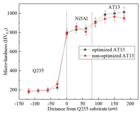 The microhardness distribution of the sprayed samples along cross-section are shown in Figure 9. It is seen that the microhardness of the samples gradually increases from the Q235 substrate to AT13 coating along cross-section direction, no matter the samples are prepared at the nonoptimized or optimized parameters. The microhardness evolution of the samples along cross-section are divided into 3 stages, which represent the microhardness of Q235 substrate, Ni5Al, and AT13 coating, respectively. The microhardness of the substrate and Ni5Al are the same in all samples, whose average values are 191.2 ± 8.7 and 837.1 ± 19.2 HV0.5, respectively, whereas, the microhardness of the AT13 coatings in both samples are much different. The average microhardness of the AT13 coating prepared at optimized parameters is 1000.6 ± 30.8 HV0.5, which is higher than that of the coating prepared at nonoptimized parameters (951.8 ± 25.7 HV0.5). This difference in microhardness of the AT13 coating was caused by the pores and cracks in the coating. The high content of pores and cracks more easily led to the expansion of the indentation, so that the microhardness of the coating was decreased. Additionally, it can be found that there is a gradual microhardness increase between the substrate and Ni5Al, Ni5Al, and AT13 coating, which is induced by the formation of the transition layers among them. The transition layers are derived from the mixture of the high-temperature melting particles and the substrates.